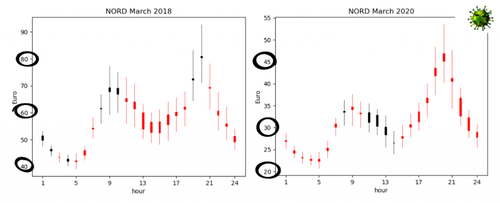 Come si vede bene dal confronto dei due grafici, il valore dell’energia elettrica si è praticamente dimezzato.